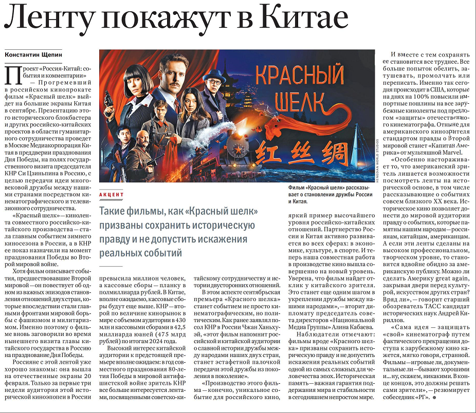 正在阅读:《俄罗斯报》刊文《中俄合拍电影〈红丝绸〉将在中国上映》