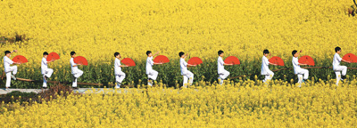 3月26日,在重庆市黔江区太极镇李子村高标准油菜花田里,该镇中心学校师生在展示太极扇。杨 敏摄(人民视觉)