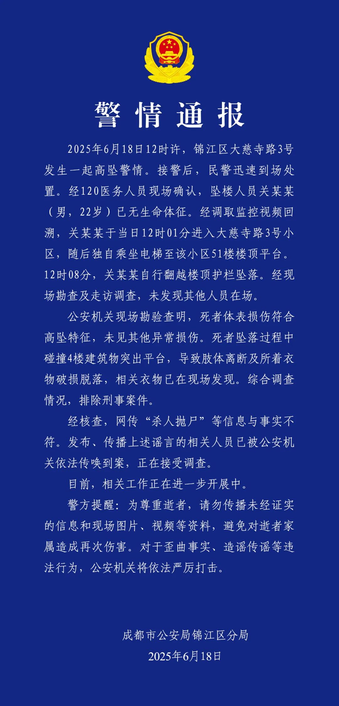 央视网消息:据成都锦江公安微信公众号消息,成都市公安局锦江区分局发布警情通报:6月18日12时许,锦江区大慈寺路3号发生一起高坠警情。接警后,民警迅速到场处置。经120医务人员现场确认,坠楼人员关某某(男,22岁)已无生命体征。经调取监控视频回溯,关某某于当日12时01分进入大慈寺路3号小区,随后独自乘坐电梯至该小区51楼楼顶平台。12时08分,关某某自行翻越楼顶护栏坠落。经现场勘查及走访调查,未发现其他人员在场。