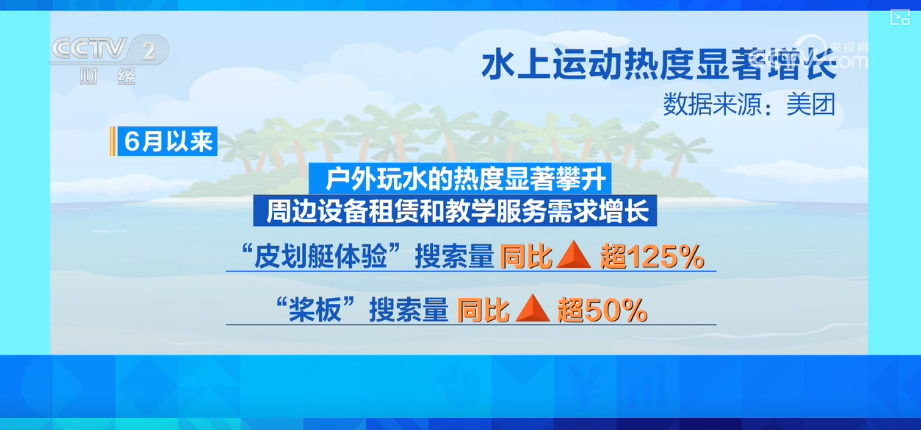 数据显示,6月以来,户外玩水的热度显著攀升,周边设备租赁和教学服务需求增长。在互联网平台,“皮划艇体验”搜索量同比增长超125%,“桨板”搜索量同比增长超50%。
