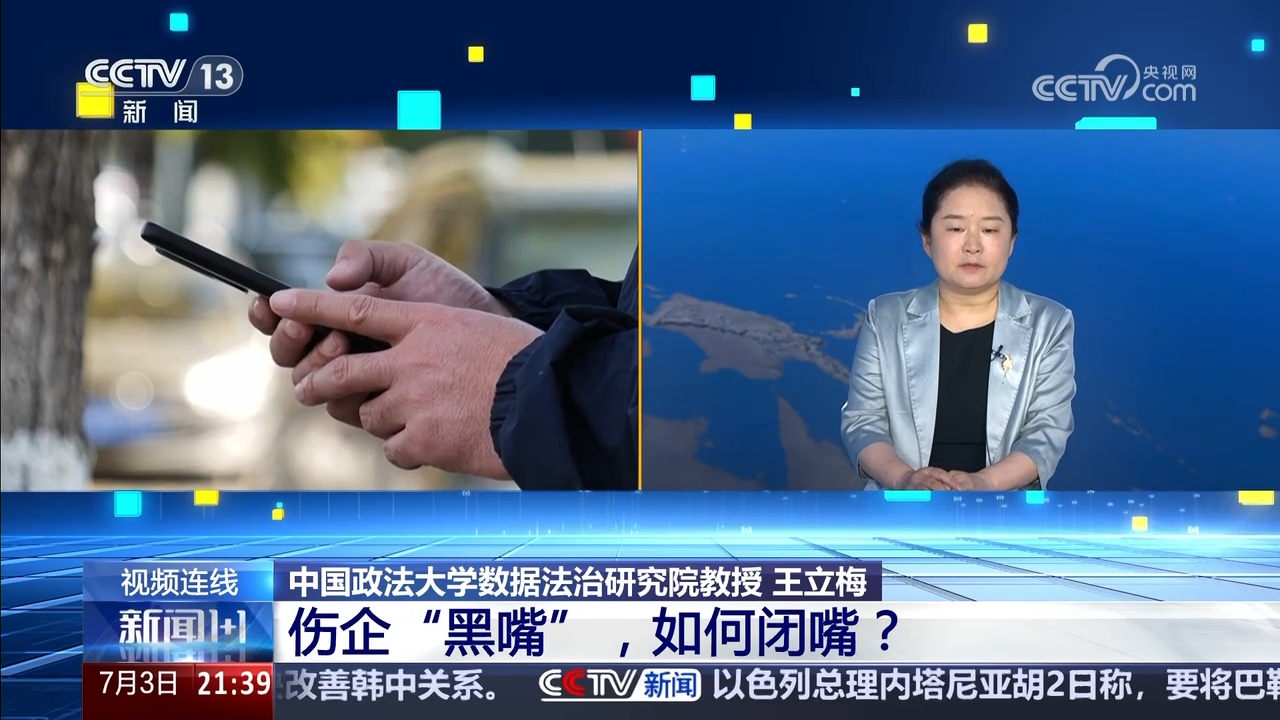 王立梅:对于这个涉企的不实信息或者网络谣言,实际上我们国家的法律是很健全的。我们从民事的侵权,比如说某个企业家他如果受到了抹黑,他可以诉名誉侵权等民事诉讼。如果案例里有的涉事人员对企业进行了敲诈勒索,达到了一定数额的话,我们也可以对他进一步追究刑事责任。
