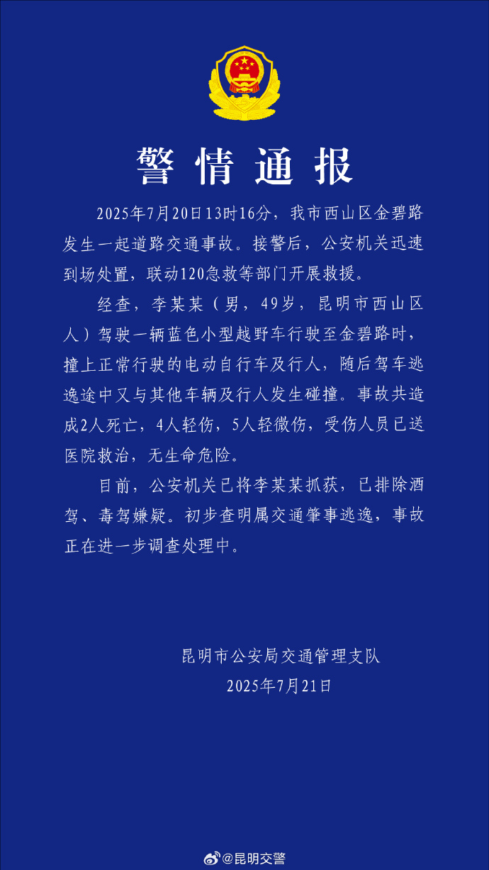 经查,李某某(男,49岁,昆明市西山区人)驾驶一辆蓝色小型越野车行驶至金碧路时,撞上正常行驶的电动自行车及行人,随后驾车逃逸途中又与其他车辆及行人发生碰撞。事故共造成2人死亡,4人轻伤,5人轻微伤,受伤人员已送医院救治,无生命危险。