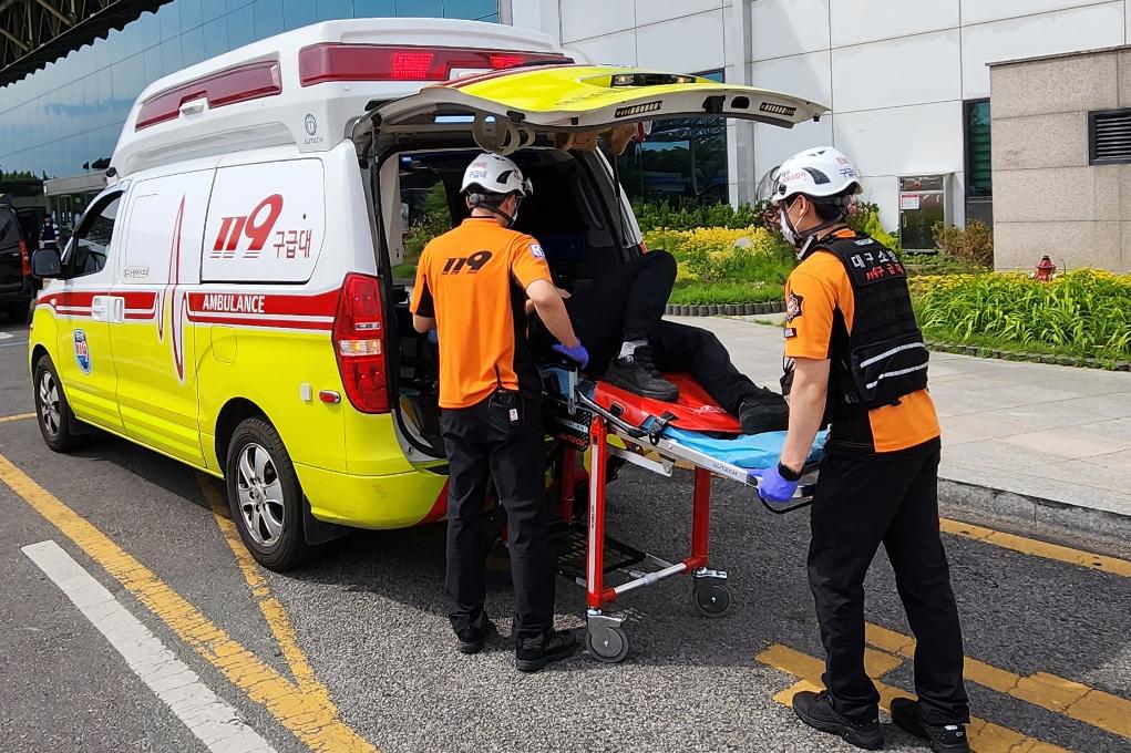 2023年5月26日,在韩国大邱机场,救援人员用担架将出现呼吸困难的乘客转移到救护车上。新华社/纽西斯通讯社