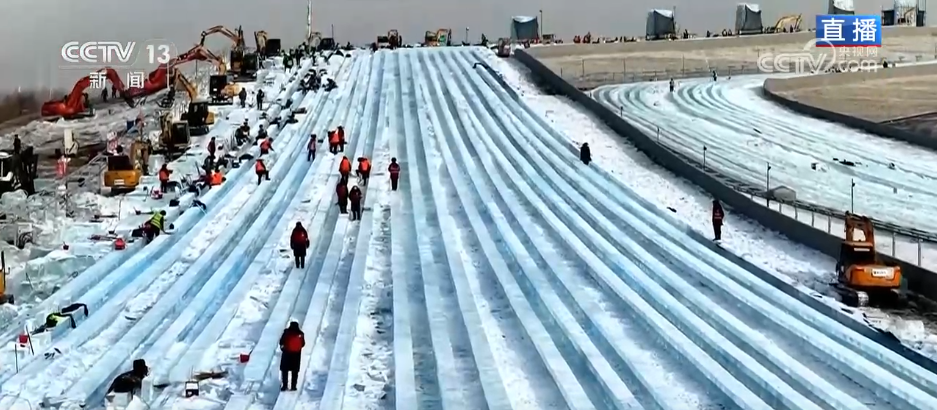 总台记者来到第二十七届哈尔滨冰雪大世界的建设现场,从松花江里采出来的巨大冰块运往冰雪大世界,成为美丽冰雕的原材料。记者身后这个已经初见雏形的庞然大物,就是园区最受欢迎的人气项目——超级冰滑梯。此时此刻,工人们正在加紧进行精细化打磨和安装。