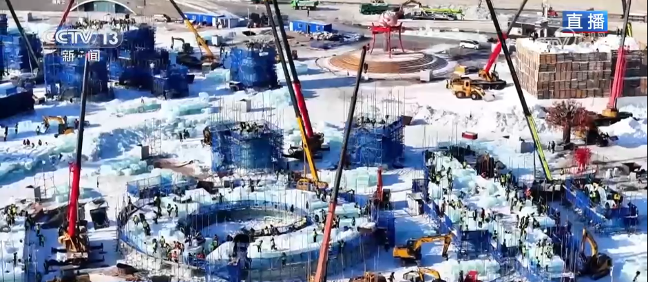 先通过航拍镜头视角,总体感受一下今年冰雪大世界的规模。可以看到,整个园区非常壮观,所有的冰建项目都已经开工。现在场地里用的大部分还是之前的存冰,不过随着今年采冰工作的全面铺开,未来,松花江会源源不断地给这里提供大量优质的冰材。画面上工人们最密集的那个核心区域,就是今年主塔的所在地。其实,每年主塔的造型都是最大的悬念之一,目前主塔的冰建进度已经过半,一起期待它最终揭开面纱的那天。
