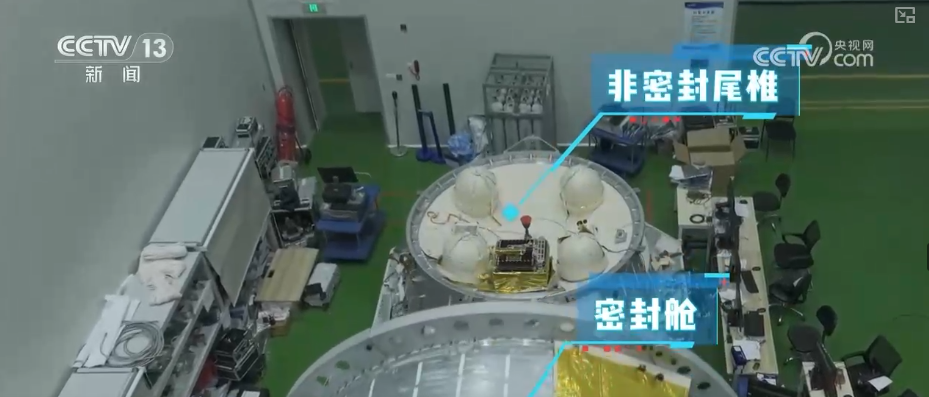 轻舟货运飞船由主体的一个密封舱和后段的一个非密封的尾椎构成。可以形象地想象成货车,就好像是一个大的密封箱以及后面一个皮卡的货斗,这样在这个密封舱里能够搭载很多精密设备仪器以及生活需要的物资。而在后面的这个开放的尾椎上,能够搭载很多其他的载荷。