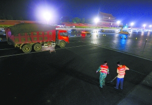 “我们要在5小时内,将4厘米厚的沥青铺上两层,才能保证路面的强度。”头戴安全帽的市政路桥建材集团总工柳浩说。说话时她的眼睛一直紧盯着测量沥青摊铺厚度的杠尺。她说,未来几天内,长安街还会用上无烟的温拌沥青和用煤矿废渣替代石料的煤矸石沥青这两种环保材料。
