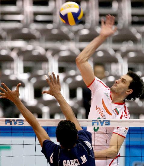 11月27日,保加利亚队球员卡基斯基(右)在比赛中扣球。当日,在2007男排世界杯比赛中,保加利亚队以3比1战胜突尼斯队。