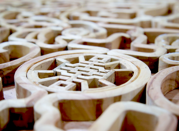 袁相华的工作台上是将要成型的一副木屏风,上面图案首尾相连自成一体,复杂而又精巧。