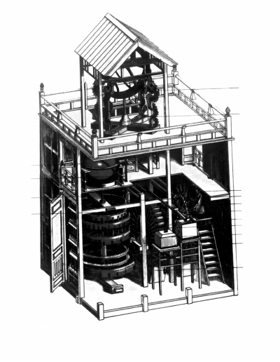 水运仪象台是北宋建造的大型天文仪器系统,是集浑仪、浑象和计时装置为一体的天文台。它的创造性主要体现在两个方面:首先是将水轮、齿轮系、控制机器、计时器、浑象和浑仪等集成为一个机械系统,反映了设计复杂机械的高水平;其次是发明了由杆系和秤漏等构成的控制机械——天衡,其功能相当于近代机械钟表的擒纵机构。