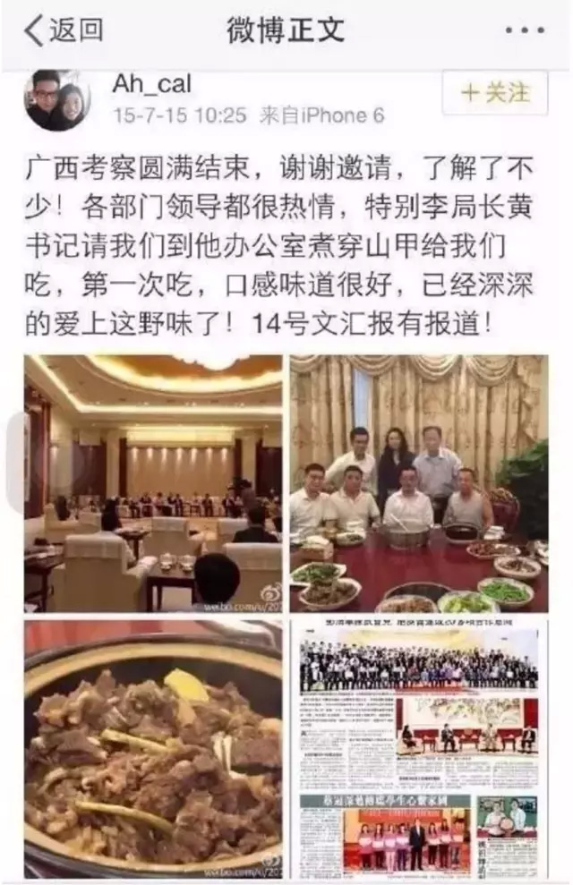 @Ah_cal在微博晒图配文称自己在广西考察期间,受当地“李局长”、“黄书记”邀请,在其办公室吃了煮穿山甲,还表示“深深地爱上了这野味”。