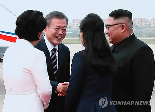 18日,金正恩夫妇在平壤机场迎接文在寅伉俪。(韩联社)