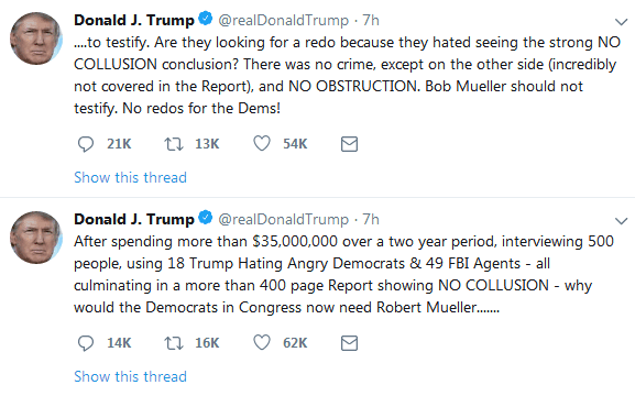 对此,特朗普5日在推特上发文说:“两年内花费超过3500万美元,采访了500人,使用了18个让特朗普痛恨、愤怒的民主党人和49个联邦调查局特工——所有这些都以一份400多页的报告告终,报告显示没有共谋——那为什么国会里的民主党人现在需要罗伯特 穆勒作证?他们是不是因为讨厌看到没有共谋的结论,而想重来一次?除了另一边的阵营(难以置信没有写在报告中),而且没有妨碍司法。穆勒不应该作证。民主党不能故技重施!”