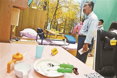 如果说科技课、机器人展吸引的多是中小学生观众,那么“养老小屋”展览区内围观的就都是老年人了。在这里,小到为手抖的老人设计的餐具、系纽扣工具,大到独居老人异常状态监测报警系统,都是为了让老人不仅生活得安全,还要生活得有尊严。