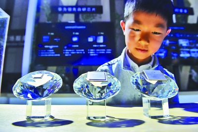 参观者在2019中国国际大数据产业博览会上参观我国自主研发的5G基站芯片组。新华社发