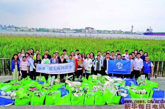 仁渡海洋的志愿者在净滩活动中留影。 本报记者张建松摄