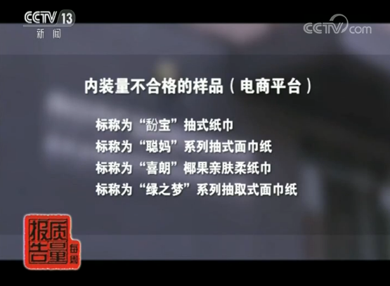 江苏省纸张印刷产品质检站检验员 贾娟:我们这次在天猫上抽了一款“雪亮”牌的面巾纸,它的月销量超过30万箱。这款是按整箱销售的,一箱是30包,折算下来的话月销量有900万包。它每包少了12张,这样子乘下来它的月销量大概少了36万包。