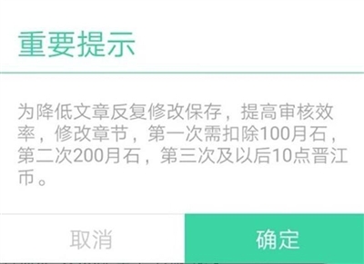 7月29日晚,晋江文学城签约作者言朝暮表示,在晋江文学城新推出的举措中,为了降低文章反复修改保存、提高审核效率,作者对章节进行修改,第一次需扣除100月石,第二次200月石,第三次及以后10点晋江币。