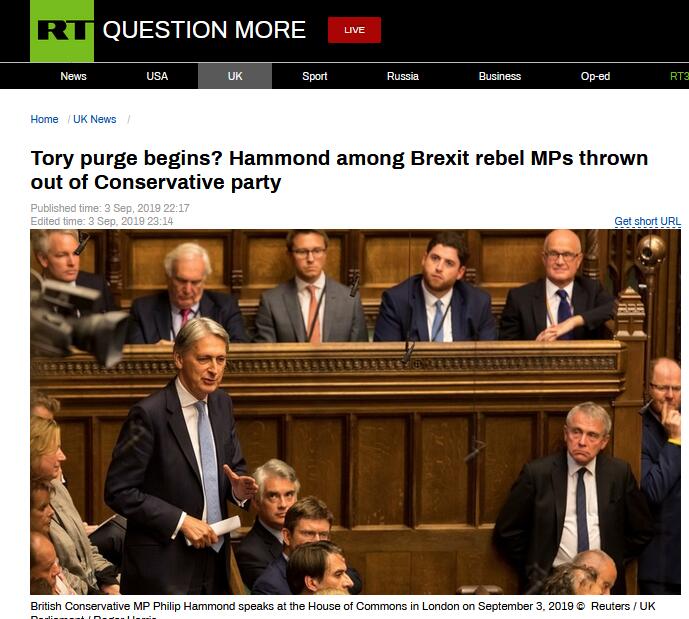 【环球网报道 记者 李东尧】“保守党内清洗开始了?哈蒙德是被赶出保守党的英国脱欧反叛者议员之一。”“今日俄罗斯”(RT)9月3日以此为题报道说,英国首相鲍里斯·约翰逊当天在下议院输掉了一场有关“无协议脱欧”的投票后,似乎正在清除党内异己,而英国前财政大臣哈蒙德是第一个被送上“断头台”的人。