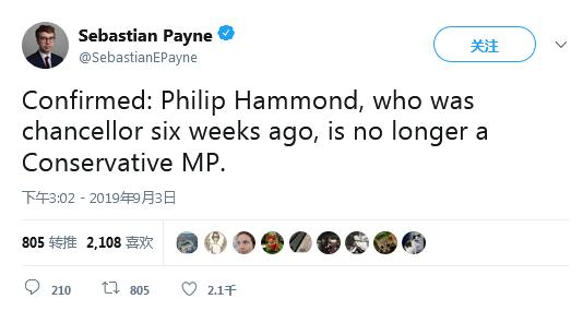 哈蒙德被开除出党的消息,得到了英国《金融时报》记者塞巴斯蒂安·佩恩(Sebastian Payne)的证实。佩恩早些时候在推特上表示,“6周前还是英国财政大臣的哈蒙德已经不再是一名保守党的议员。”
