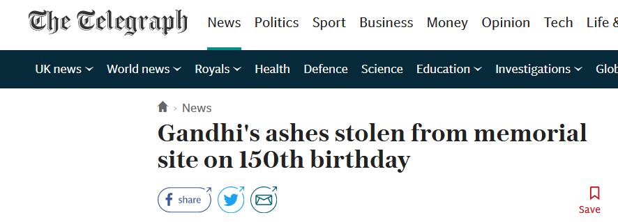 综合英国《每日电讯报》、《今日印度》等媒体10月3日报道,本周三(2日),正当全世界都在纪念圣雄甘地诞辰150周年之际,一些不明身份的暴徒在印度中央邦雷瓦的巴普巴旺(Bapu Bhawan)纪念地偷走了甘地的骨灰。这些人还在甘地的照片上用绿漆写上“叛国者”的字样。
