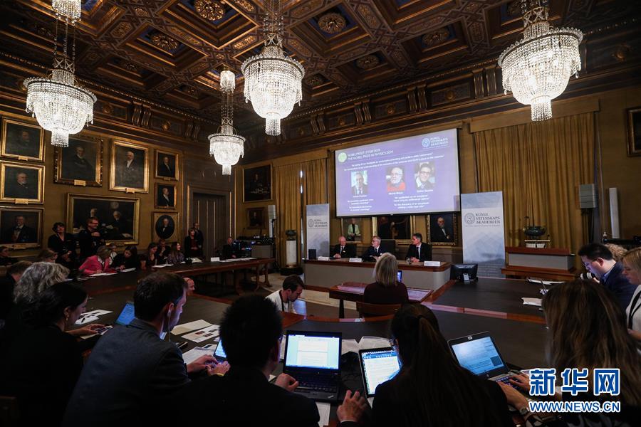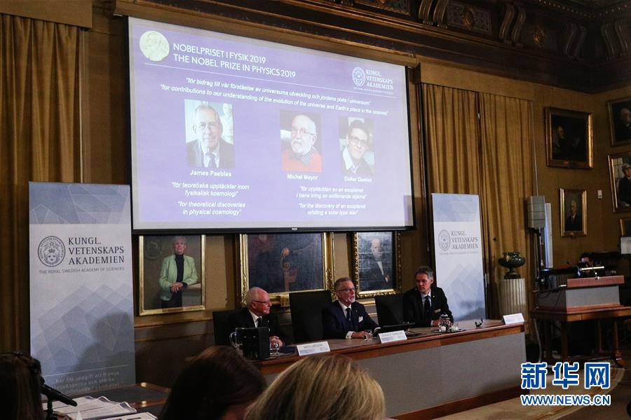10月8日,在瑞典斯德哥尔摩,瑞典皇家科学院公布2019年诺贝尔物理学奖获得者。新华社记者郑焕松摄