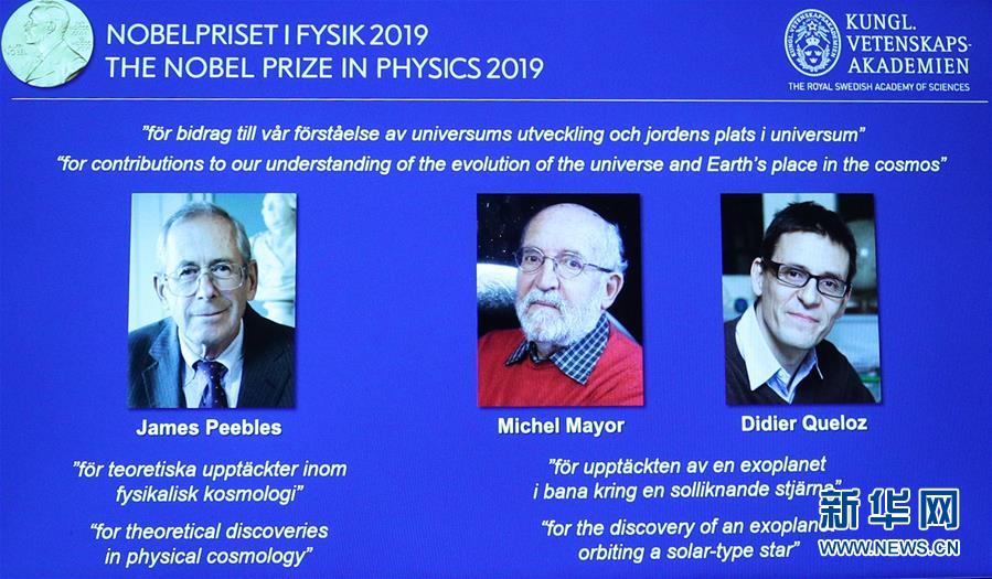 新华社斯德哥尔摩10月8日电(记者和苗 付一鸣)瑞典皇家科学院8日宣布,将2019年诺贝尔物理学奖授予三名科学家。来自美国的詹姆斯·皮布尔斯因宇宙学相关研究获奖,来自瑞士的米歇尔·马约尔和迪迪埃·奎洛兹因首次发现太阳系外行星获奖。