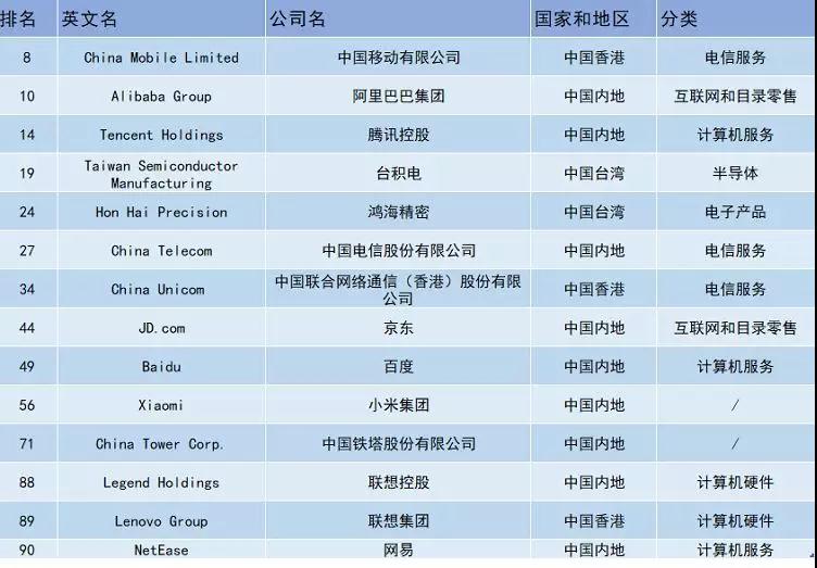 除上述3家企业外,上榜的中国企业还有台积电、鸿海精密、中国电信、中国联通(香港)、京东、百度、小米集团、中国铁塔、联想控股、联想集团和网易。