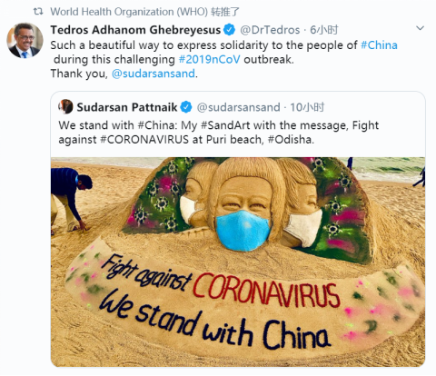【环球网报道 记者 张晓雅】“抗击新冠病毒,我们与中国同在”——印度沙雕艺术家苏达森·帕特尼克(Sudarsan Pattnaik)在印度海滩上创作的“抗疫”雕塑10日获得世界卫生组织(WHO)总干事谭德塞的点赞。谭德塞在推特上表示,疫情当下,这是向中国人表达团结的美好方式。