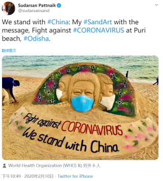 帕特尼克10日在社交媒体推特上发文称,“在(印度)奥迪沙邦普里海滩,我的作品寓意着,抗击新型冠状病毒,我们与中国同在。”配图能够看到,沙堆上有三个戴着口罩的头像,头像四周,分布着“病毒”样的花纹,作品中上写有“抗击新冠病毒,我们与中国同在”的英文字样。