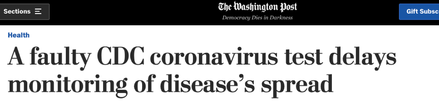 《纽约时报》称,2月份时,各州开展的新冠病毒检测数量非常有限,这一方面是由于美国疾控中心派发的检测盒质量出现问题,另一方面是由于当时美国检测范围过窄,只有有中国旅行史或者接触过确诊患者的人出现症状才能够得到检测。