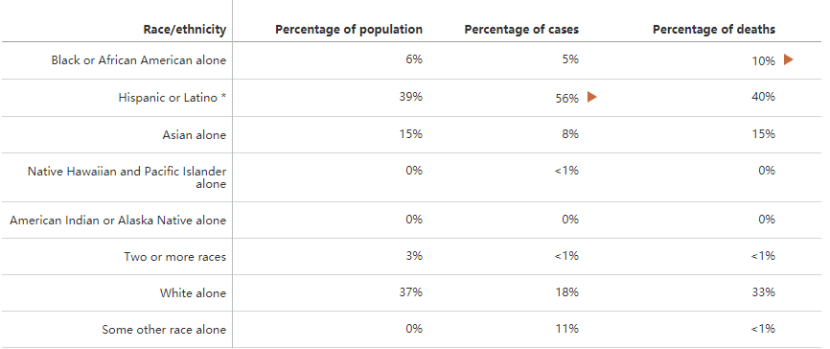 加利福尼亚州西班牙裔和拉丁裔占该州总人口39%,确诊病例和死亡病例却分别高达56%和40%。