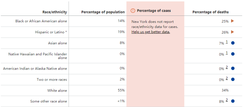纽约州非洲裔占该州总人口的14%,死亡病例却高达25%;西班牙裔和拉丁裔占该州总人口的19%,死亡病例占26%;值得注意的是,纽约州并没有统计确诊病例的种族构成数据。