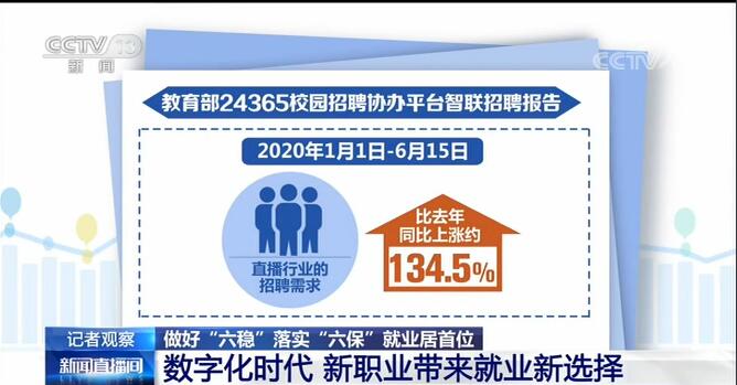据教育部统计,今年互联网和电子商务类的岗位总数猛增,比2019年增加了129917个。教育部24365校园招聘协办平台智联招聘的报告也显示,今年1月1日到6月15日,直播行业的招聘需求比去年同比上涨大约134.5%,互联网营销师这个新职业正在成为大学生就业的新选择。