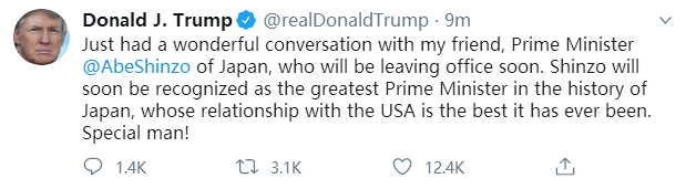 【环球网报道】美国总统特朗普发推特称,刚刚和我的朋友日本首相安倍晋三进行了一次精彩的谈话,他不久后即将离任。安倍晋三将很快被公认为日本历史上最伟大的首相,日本与美国的关系是有史以来最好的。特别的人物!