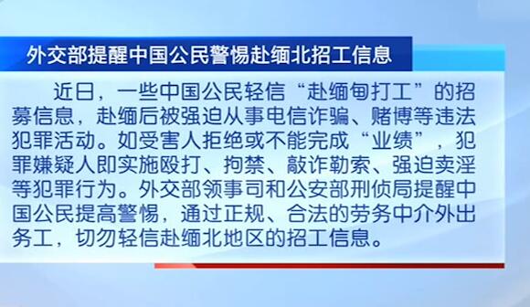 央视网消息:近日,一些中国公民轻信“赴缅甸打工”的招募信息,赴缅后被强迫从事电信诈骗、赌博等违法犯罪活动。如受害人拒绝或不能完成“业绩”,犯罪嫌疑人即实施殴打、拘禁、敲诈勒索、强迫卖淫等犯罪行为。外交部领事司和公安部刑侦局提醒中国公民提高警惕,通过正规、合法的劳务中介外出务工,切勿轻信赴缅北地区的招工信息。