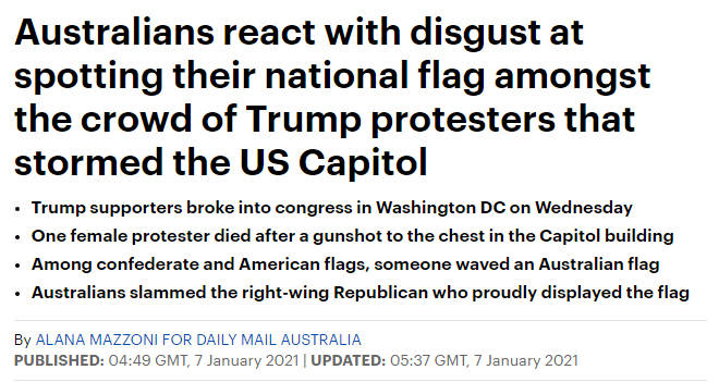 《每日邮报》报道称,澳大利亚人对美骚乱现场出现澳国旗一幕感到厌恶。