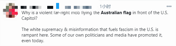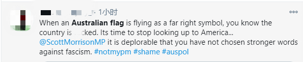 有网友指出,“当澳大利亚国旗作为‘右翼标志’出现在那里,你们知道这个国家糟透了,是时候停止仰望美国了。莫里森面对这种‘法西斯主义’没有选择强硬的措辞,令人愤慨。”