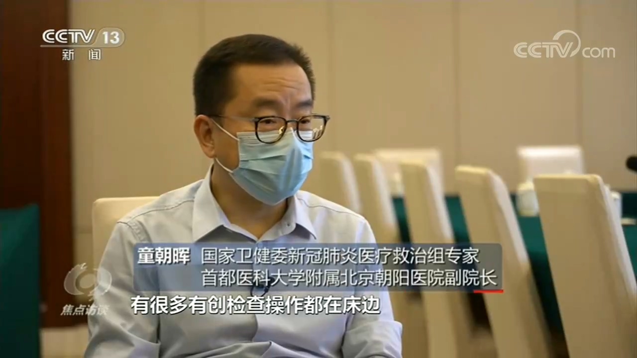 国家卫健委新冠肺炎医疗救治组专家、首都医科大学附属北京朝阳医院副院长童朝晖说:“因为这种重病人有很多有创检查操作都在床边,所以需要我们亲自去看亲自去观察,有时候对危重症病人在床边一待就两个小时,才把问题搞清楚,然后作出判断再讨论出诊疗方案。”