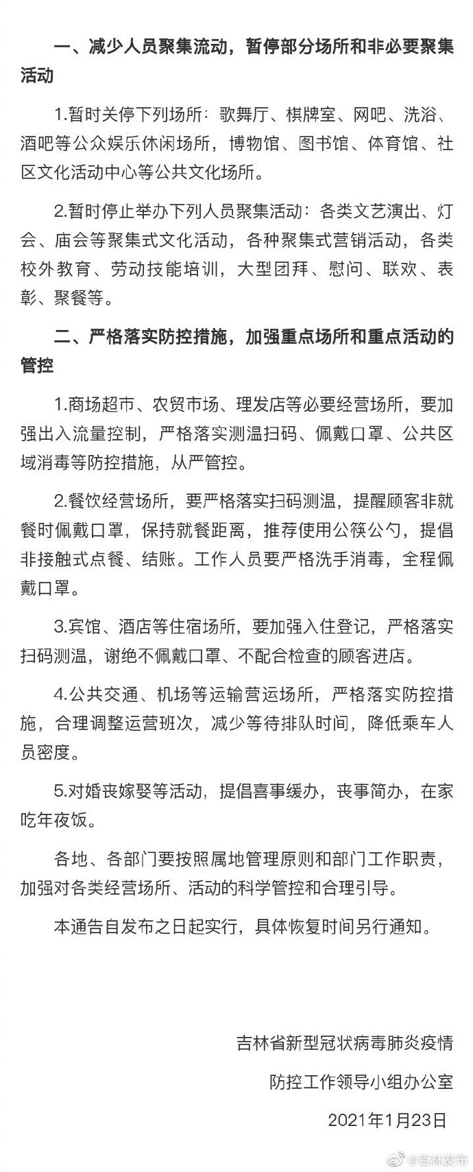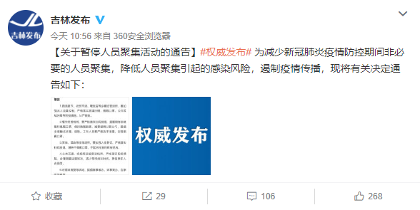 今天(24日)吉林省新冠肺炎疫情防控工作领导小组办公室发布通告,要求暂停人员聚集活动。