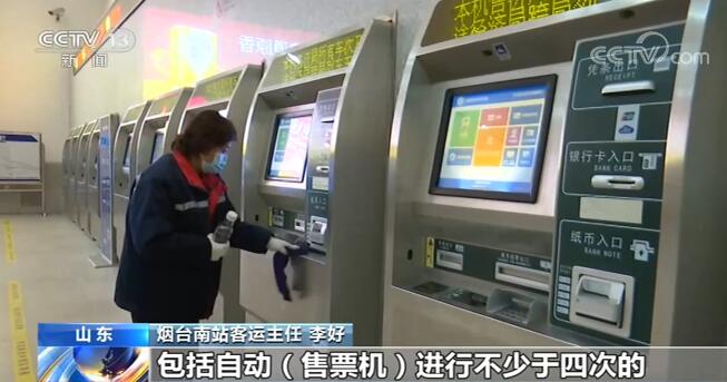 烟台南站客运主任 李好:我们会对旅客重点使用的比方说像门帘、旅客座椅的扶手还有经常使用到的检票闸机,包括自动售票机进行不少于四次的重点擦拭消杀。