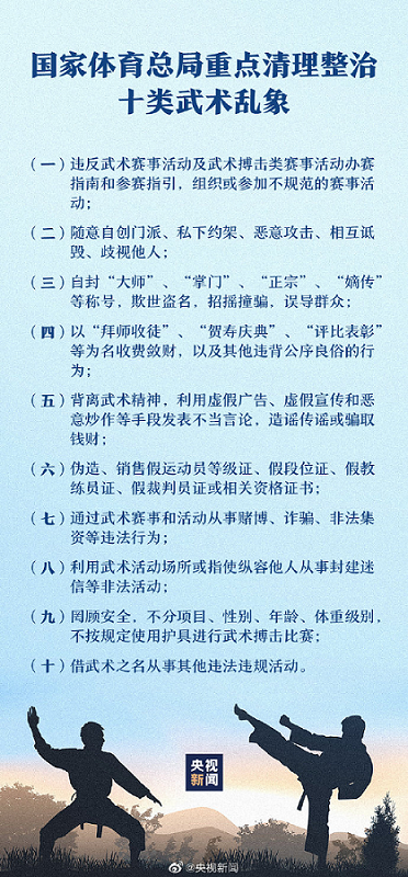 近日,国家体育总局发文重点清理自封大师等武术乱象,明确须重点整治: