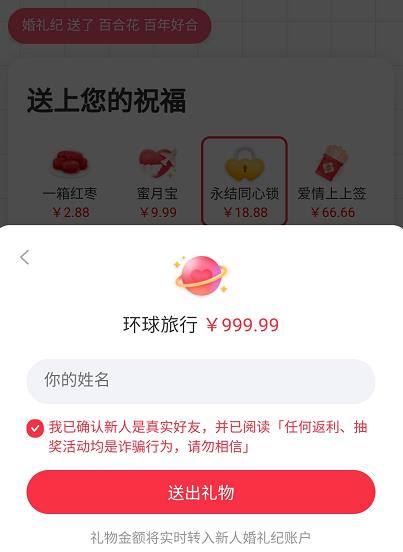 以“婚礼纪App”为例,通过其App制作的请柬配备接收红包及提现功能,收到请柬的用户可选择消费祝福礼物,或自定义红包,而礼物价格最低为2.88元,最高为999元。天眼查App显示,婚礼纪为一家结婚服务平台,2012年成立至今共经历7次融资,其中2019年3月获得7000万美元D轮融资。
