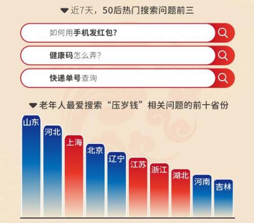 在“数字感”越来越强的春节里,一些老年人也保持着学习的步伐。上述报告中称,“如何用手机发红包”已成为老年人新的热门搜索问题。截至2月3日,近一月以来,问题“压岁钱给多少合适”的相关搜索热度环比上涨130%。数据显示,山东、河北、上海等地的老年群体对发红包尤为热衷,发红包的年俗在“云”中得以延续。