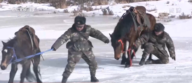 四级军士长田存良已经是第4个年头在巡逻路上过年了,每次巡逻他都打头阵,为大家开辟安全路线。牵马“溜冰”步步涉险,冰面不时发出一阵阵断裂声,大家手脚并用,小心翼翼牵着马走出危险区。