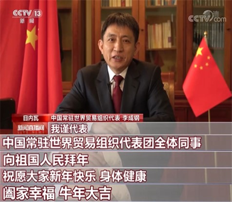 中国常驻世界贸易组织代表李成钢表示,牛年恰逢中国加入世界贸易组织二十周年,我们将不断推进高水平的贸易投资自由化、便利化,服务国家构建新的发展格局,弘扬多边主义,为推动世界经济尽早复苏做出更大努力。