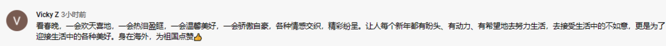 海外网友Vicky Z留言:“看春晚,一会欢天喜地,一会热泪盈眶,一会温馨美好,一会骄傲自豪,各种情感交织,精彩纷呈。让人每个新年都有盼头、有动力、有希望地去努力生活,去接受生活中的不如意,更是为了迎接生活中的各种美好。身在海外,为祖国点赞。”