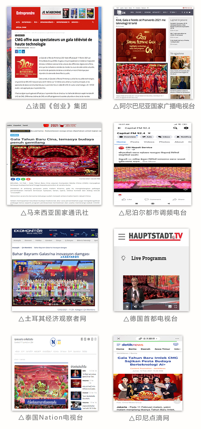 法国《创业》媒体集团网站、德国首都电视台、阿尔巴尼亚国家广播电视台官网、马来西亚国家通讯社、尼泊尔都市调频电台、土耳其经济观察者网、斯里兰卡国家电视台、泰国Nation电视台、印尼点滴网等媒体高度评价春晚创新采用前沿技术手段,充分展示了总台“5G+4K/8K+AI”发展的最新成果。