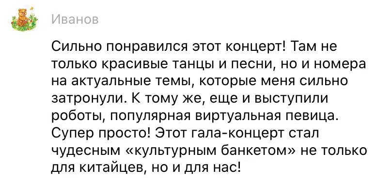 VK网友伊万诺夫留言:“太喜欢这场晚会了!这里不仅能看到精彩的歌舞,而且还有很多反映时代主题的节目,令我深受感动。机器人和虚拟歌手的表演科技感十足,特别赞!这场晚会无论对于中国人,还是对于我们来说,都是一场美妙精彩的文化盛宴!”
