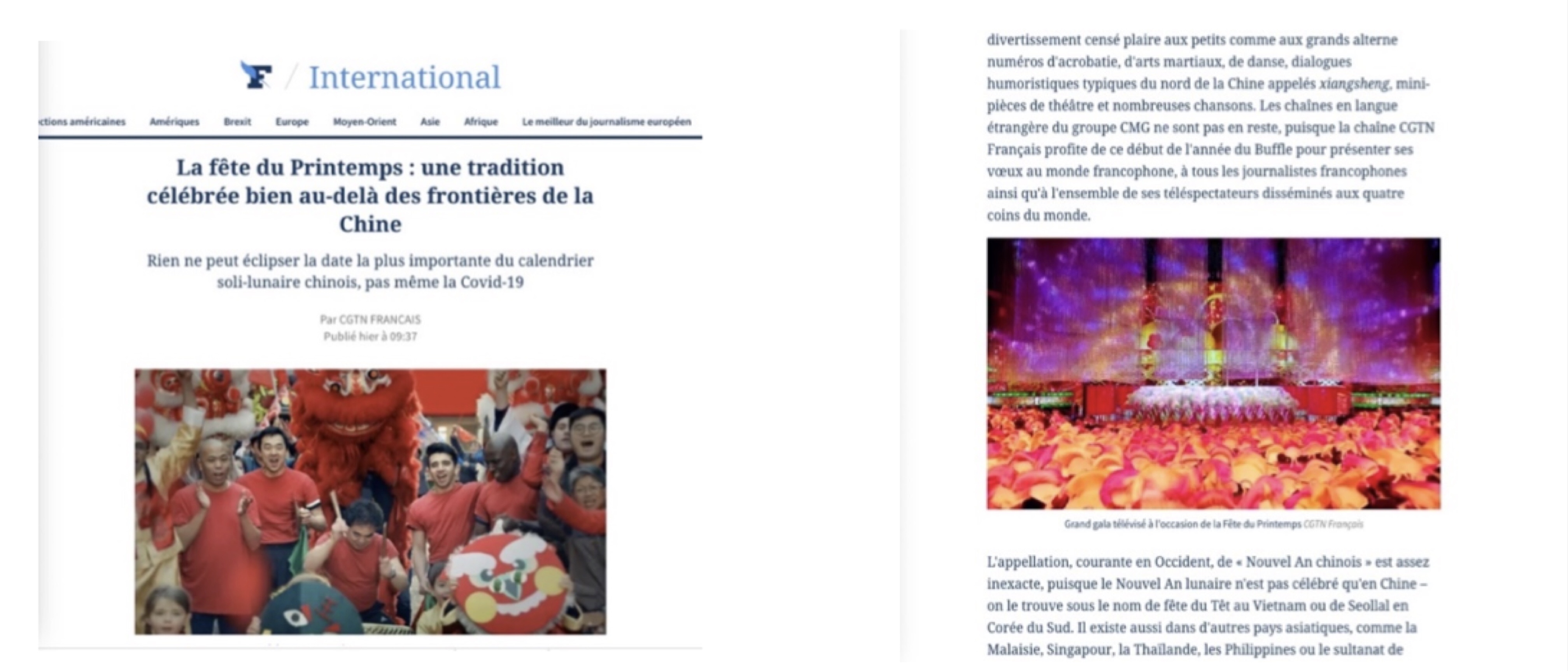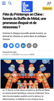 法国《北方之声》网站刊发特稿《中国春节:牛年将带来希望与新生》称,2021年春节联欢晚会的总导演让十几亿人暂时忘记了过去一年疫情带来的阴霾。四个小时如梦如幻的晚会带给人们太多感动,晚会多次致敬了那些与病毒战斗的医护人员,温暖人心。